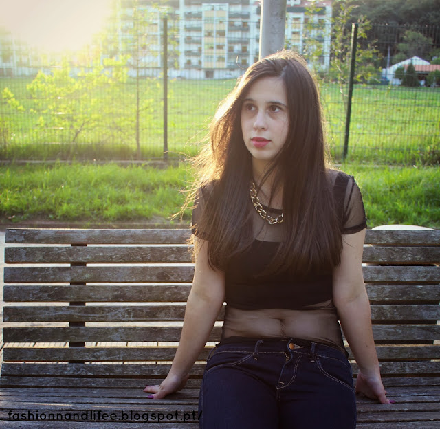 Last week I went to a park with my friends and I wore this sheer black blouse and underneath it I had a crop-top and I picked up a golden necklace to "glamour it" up a little bit and I think it went pretty well. I chose skinny jeans and to have a more sofisticated look I added my high heels and a clutch/ handbag.